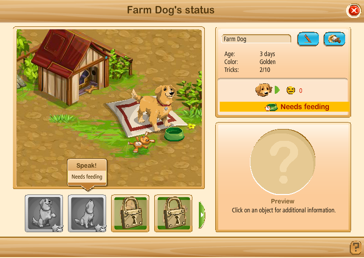 Hello, when I set off my farm , I click my dog with yellow smileys for " harvest " nothing happens , no points for satisfaction . I refreshes each time for his satisfaction points, and other parts , to the day , I have not the stock market with the question mark that appears above the dog. thank you in advance to improve this defect.