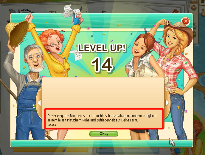 it did lack a picture. I tried to enter Horse ranch but got a level up text in German again, instead. When I entered the main farm, think got o.k.: I got a level up text again, but this time as it should be (in English and with picture) and main farm opened without problems. After that everything is runing normaly.