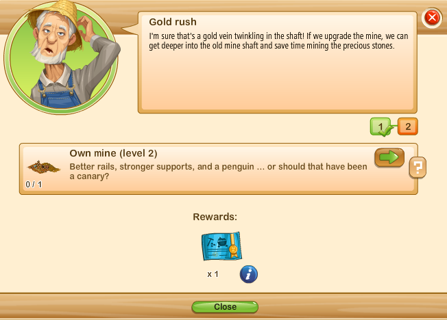 I upgraded my mine from the start bc I bought Ohmars gold certificate w/tokens and wanted to cash in.....but now its (the game prompt) telling me to upgrade my mine to level 2, but it is not recognizing that it is done already. I have built and upgraded many things before the game told me to and I have always received the reward when it comes up. But how funny is it that the bug happens to be on the mine with the reward of another gold certificate..lol