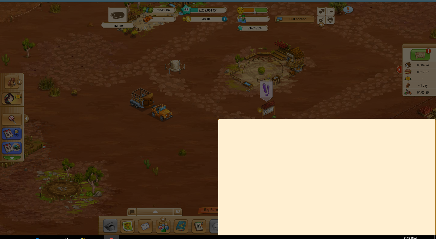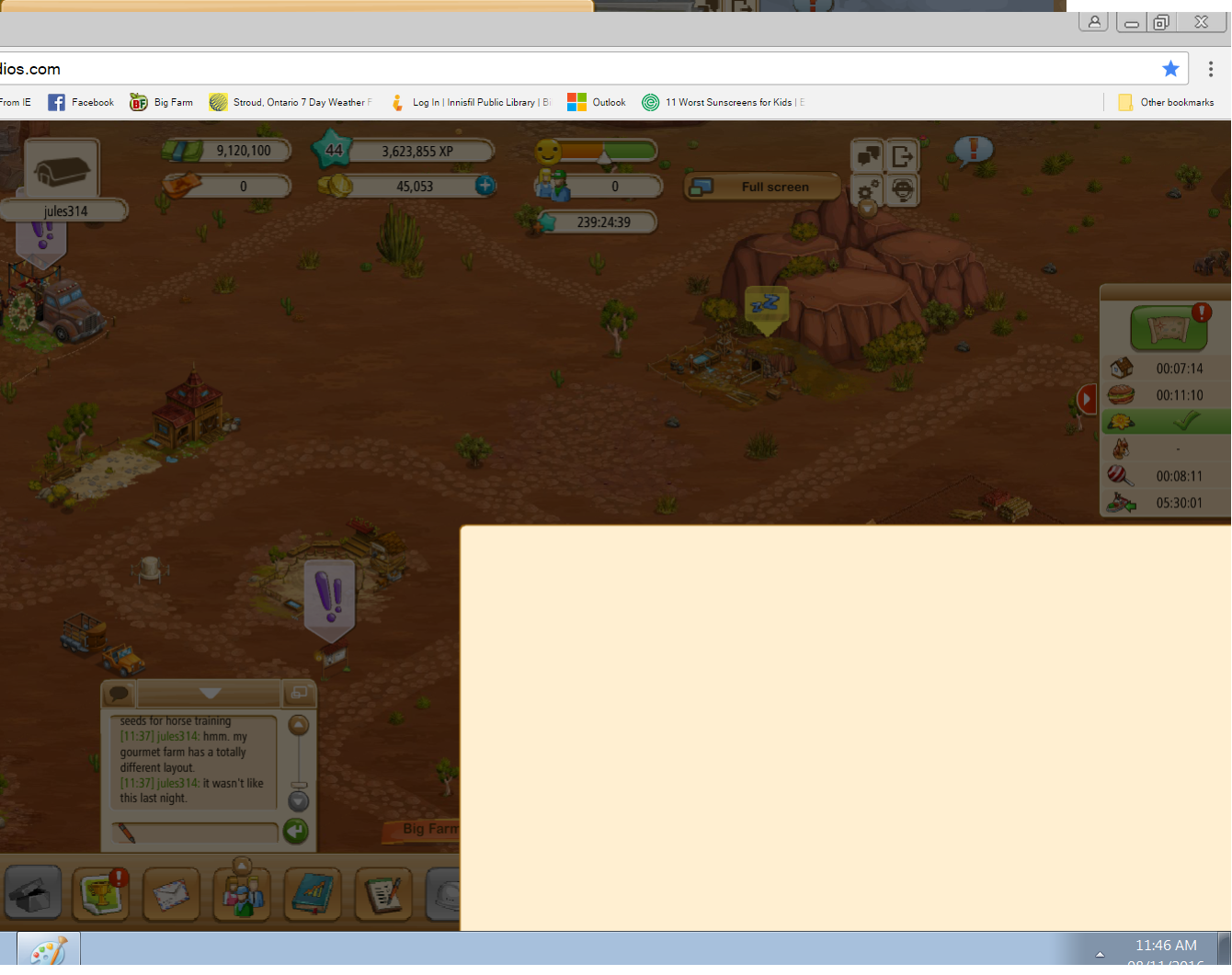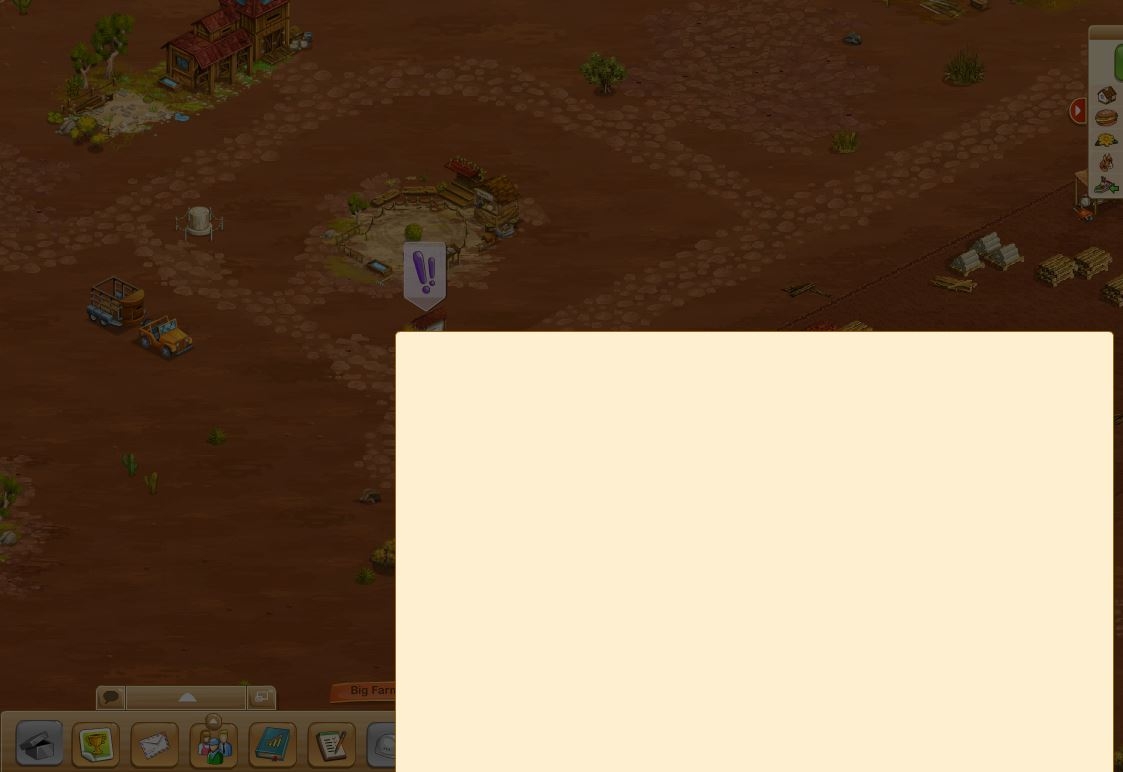 Wanted to open the notice board--white square opens to the bottom right, game freezes. Can only close Firefox and log in again to play the farm again. Happens since last night.