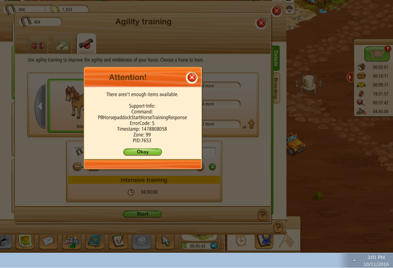 I have sufficient horseshoes to train my horse but the game won't let me. I am trying to use 400 of the 404 that I have.