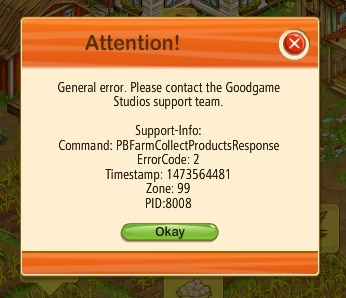 Hello! I have the whole day at the main farm fails, the collection of the finished product comes out is such an inscription (General Error. Please contact support "Goodgame Studios".